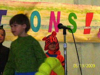 Brandon had a busy May. First was career day where Scott went to talk about being a wildland firefighter and Brandon got to show off to his class and learn about a lot of other careers. He has decided that he wants to try karate which makes sense because he is always running around pretending to do it anyway. Then he had his field trip to the zoo and the city park rides. He had fun and I went to be with him but it was ninety degrees that day so all the kids were pretty worn out. Scott took Jessie to the park to feed the ducks and play and have lunch so they had their special day. Last Friday was Brandon's first field day. He got third place at the 50 yard dash that all the kids run and they all got ribbons so that every child got at least one ribbon. The other games the kindergarten kids played was egg toss, water race and group dance. The kids didn't play for ribbons, they just got tickets for gumballs. They all had a great time. Today was graduation. The kids have a program called zoo phonics to help them learn the alphabet letter sounds. It seems to really work and they all dressed up in animal costumes and sang the zoo phonics song and then individually came up and said their sound. Brandon was "Inny Inchworm, he wore a green shirt that was supposed to be the leaves of a tree and had a big stuffed inchworm on his arm.
